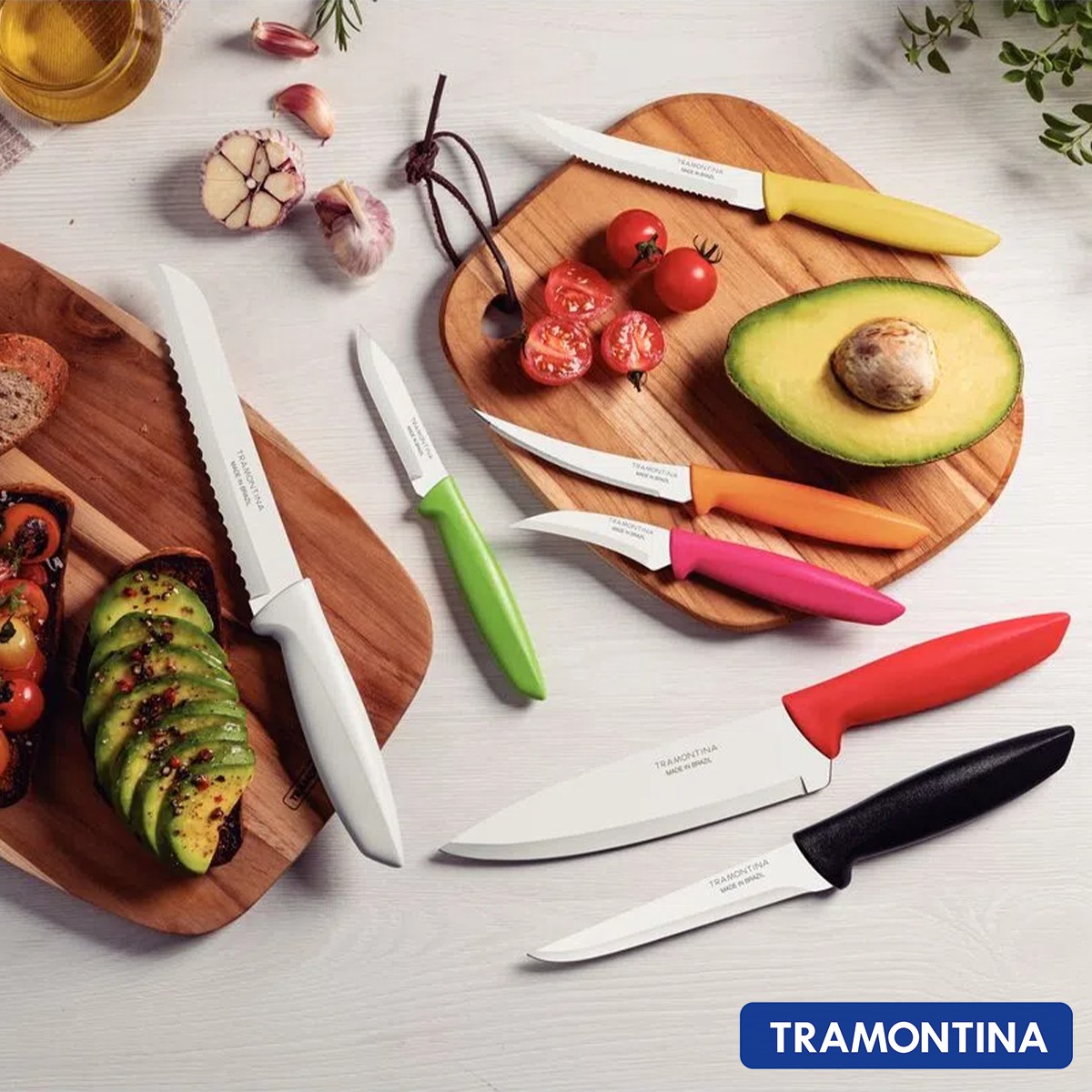 Recomenda-se o uso de tábuas de polipropileno ou madeira da Tramontina para maior durabilidade do fio das facas.